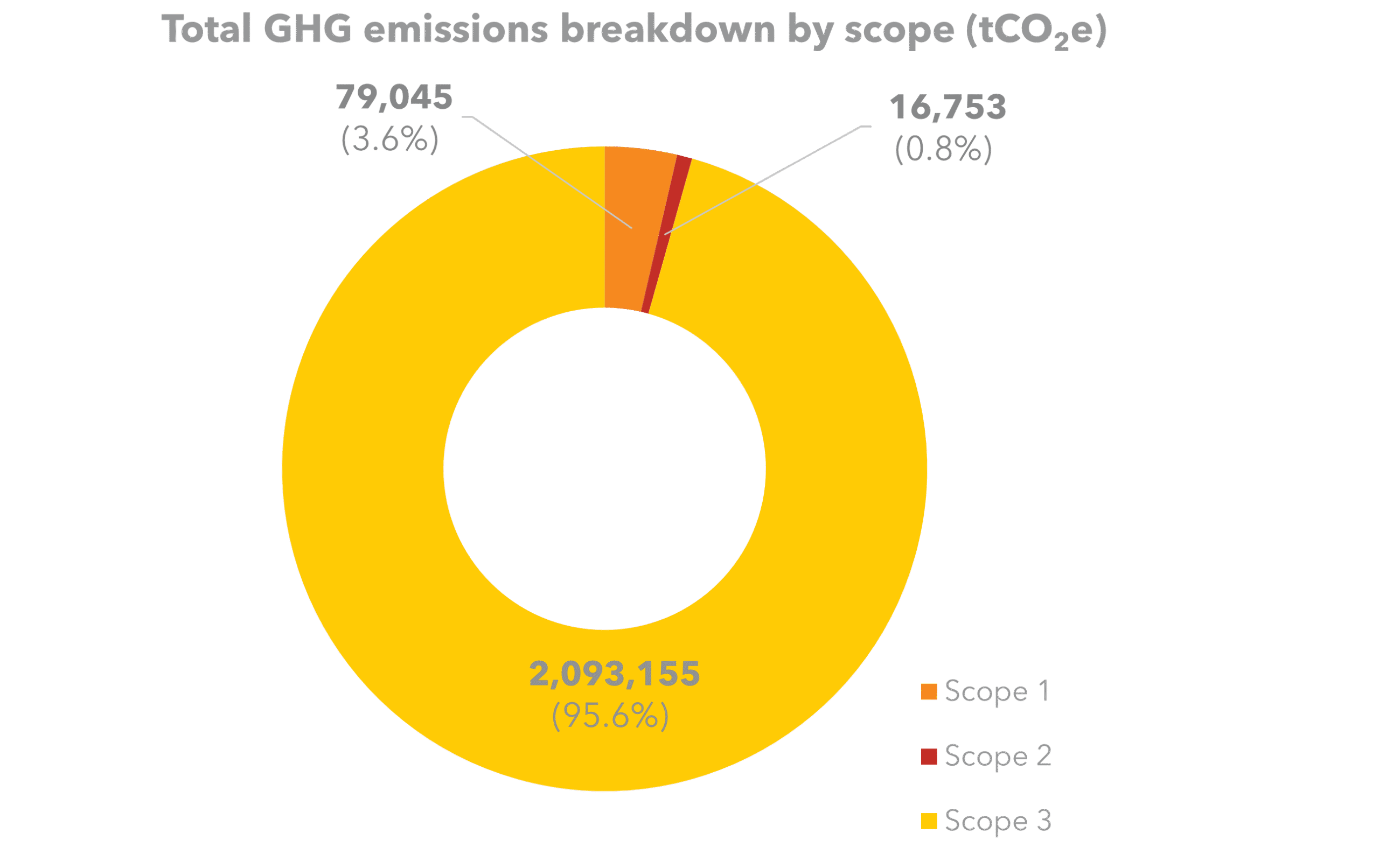 For our 2024 reporting period, our combined GHG emissions were 2,188,953CO2e. Scope 3 emissions accounted for 95.6%, scope 1 for 3.6% and scope 2 for 0.8% of our total emissions.