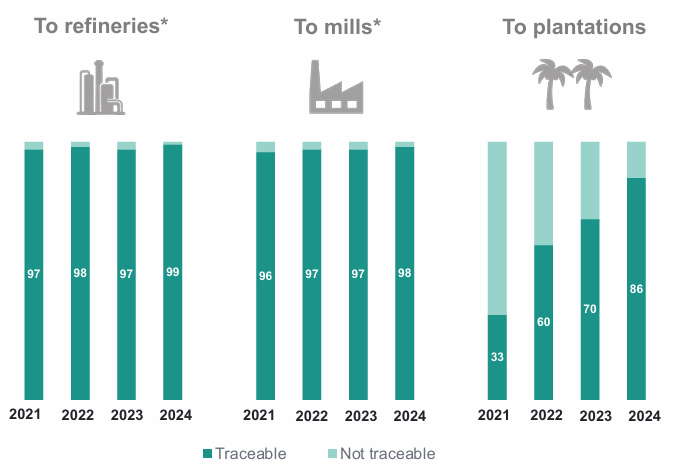 In 2025, we completed our seventh annual palm transparency and risk mapping exercise. Through working with our direct and indirect suppliers, we evaluated our 2024 palm volumes. We were pleased to increase our supply chain transparency at all levels, achieving transparency levels of 99.0% at refinery level, 97.5% at mill level and 85.6% at plantation level. We also updated our risk assessment at geographical level.